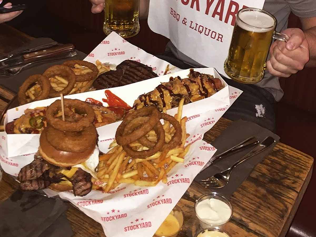 Three patties topped with cheese bacon, pulled pork, a runny scrambled egg and topped with onion rings, a huge tray filled with a ribeye steak, a half-meter hotdog, fries, onion rings, and a Triple Homicide Burger. If it wasn’t enough, in 30 minutes, you have to complete the whole plate and two pints bigger. You get the food for free, a picture on the wall of fame, and a Stockyard Rodeo t-shirt if you manage to choke it down in time.
